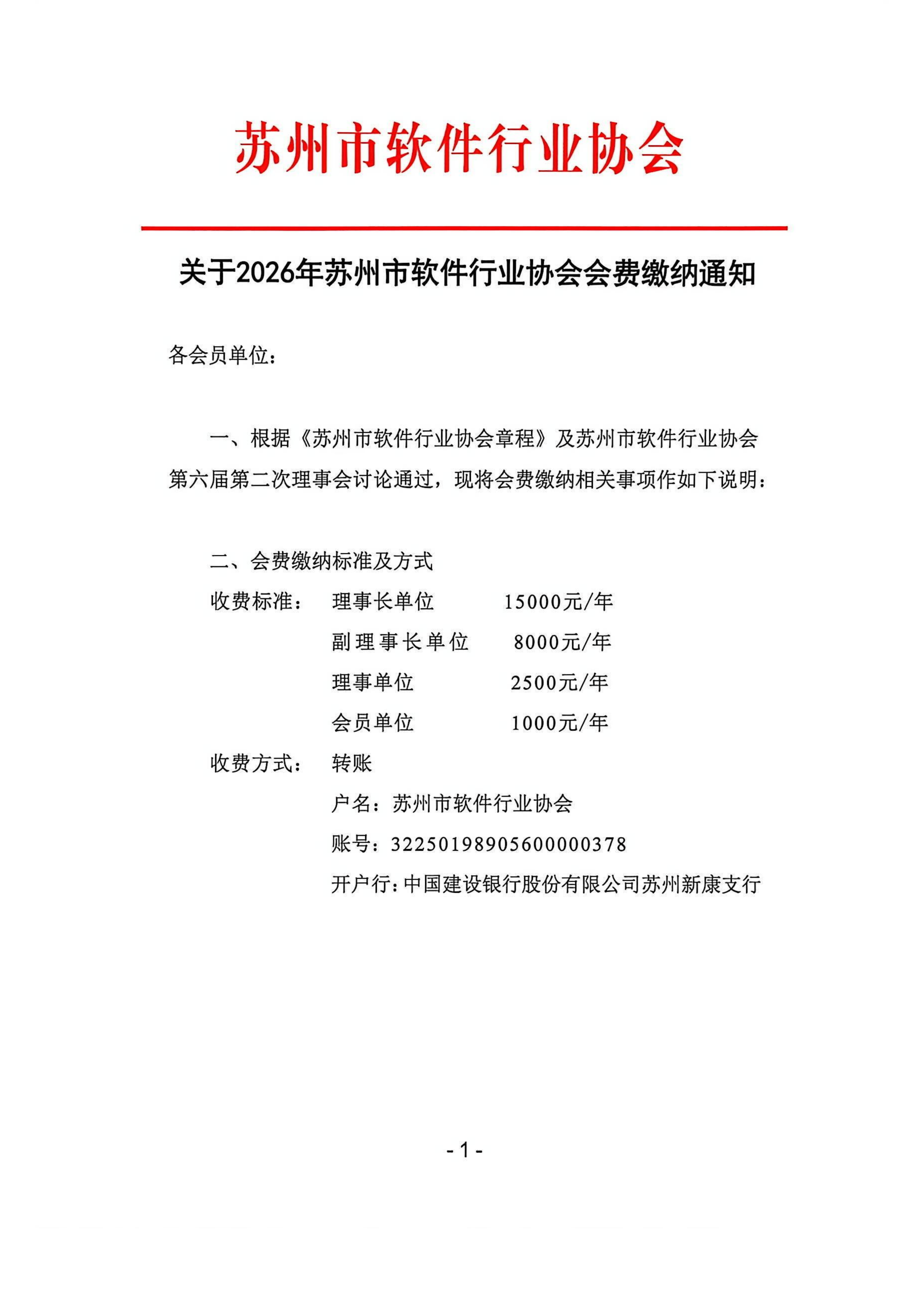 关于2026年苏州市软件行业协会会费缴纳通知