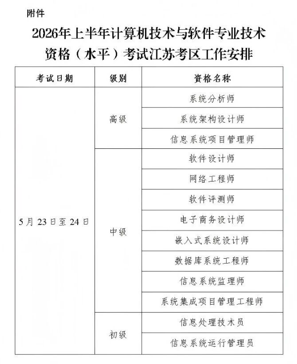 根据全国计算机专业技术资格考试办公室《关于2026年度计算机技术与软件专业技术资格(水平)考试工作计划及有关事项的通知》(计考办〔2026〕1号)、《关于做好2026年度计算机技术与软件专业技术资格(水平)考试工作的通知》(计考办〔2026〕2号)的要求,现就2026年上半年计算机技术与软件专业技术资格(水平)考试(以下简称计算机软件资格考试)江苏考区报考有关事项通告如下: