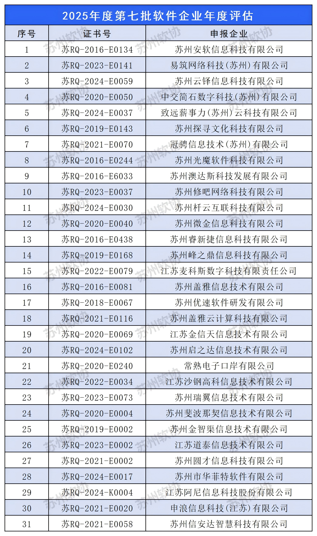 苏州市2025年度第七批软件企业年度评估公示名单